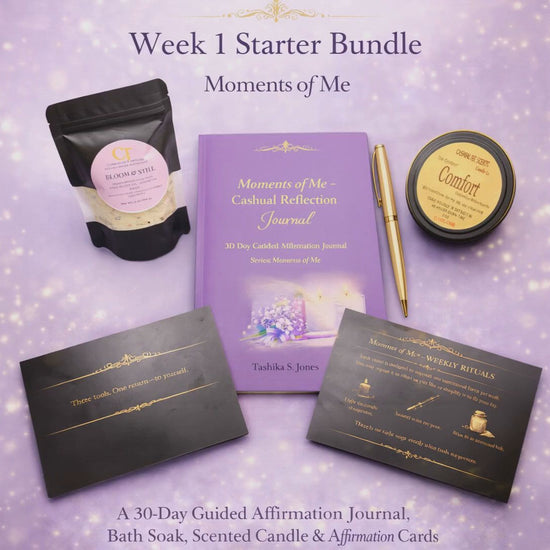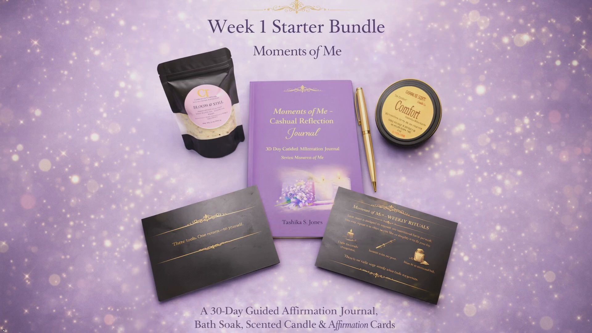 The Moments of Me® Cashual Reflections Ritual Bundle – Week One Starter Kit is designed to introduce you to the power of intentional self-care through reflection, relaxation, and restoration.